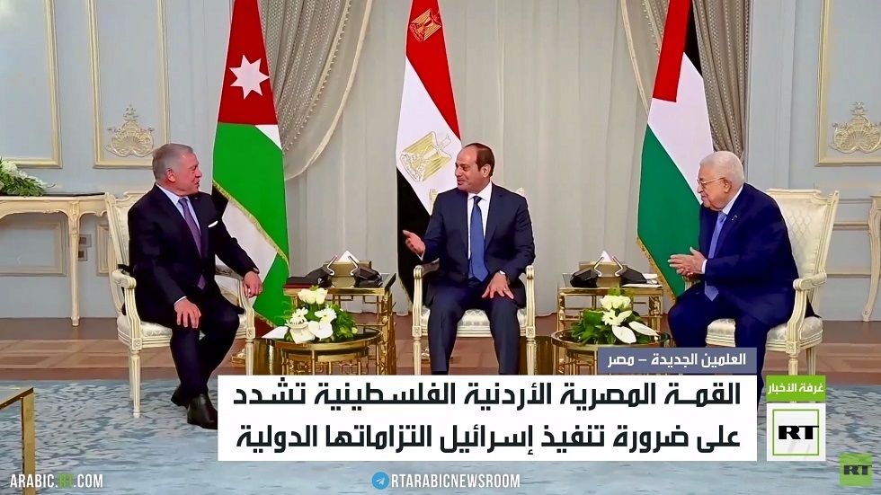 وشدد البيان للقمة التي جمعت الرئيس المصري عبد الفتاح السيسي ونظيره الفلسطيني محمود عباس وملك الأردن عبد الله الثاني بالعلمين،على وجوب تنفيذ إسرائيل التزاماتها وتعهداتها وفقا للقانون الدولي، إضافة إلى الاتفاقات والتفاهمات السابقة.