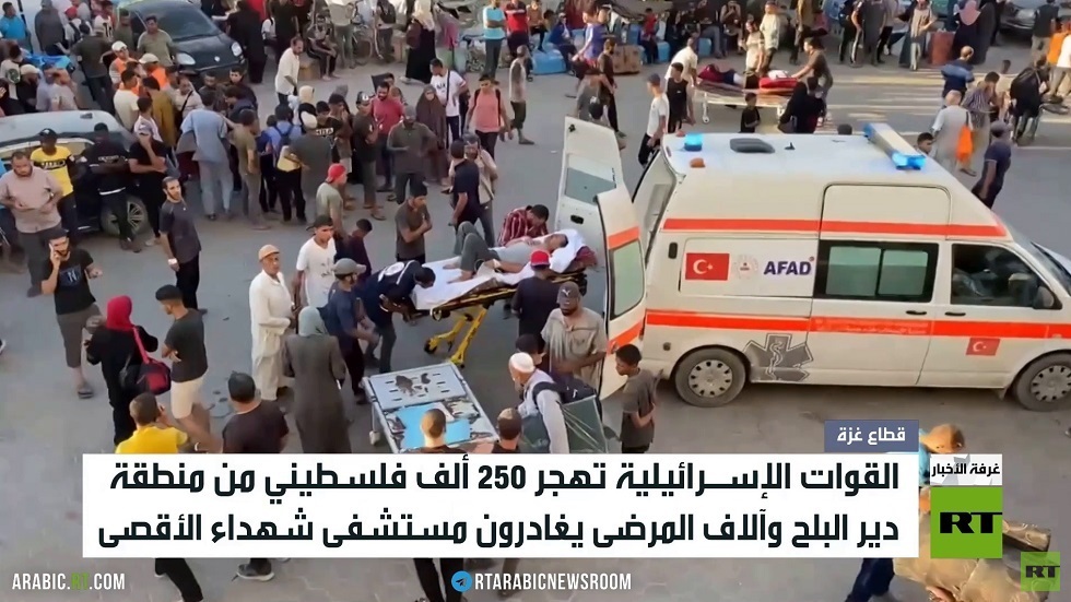 وأضاف مراسلنا أن القوات الإسرائيلية قصفت مخيم جباليا شمال القطاع وحي الزيتون جنوبي غزة، ودير البلح ومخيمي المغازي والنصيرات وسط القطاع.. هذا وأعلنت الفصائل الفلسطينية إيقاع قوة إسرائيلية بين قتيل وجريح بكمين محكم بخان يونس، واستهداف القوات المتوغلة بدير البلح والبريج وسط القطاع، بالتزامن مع نزوح ربع مليون شخص من دير البلح عقب أوامر إسرائيلية بإخلاء المنطقة المحيطة بمستشفى شهداء الأقصى.. بمن فيهم مئات المرضى.. خشية اقتحامه، على غرار مستشفى الشفاء بغزة.