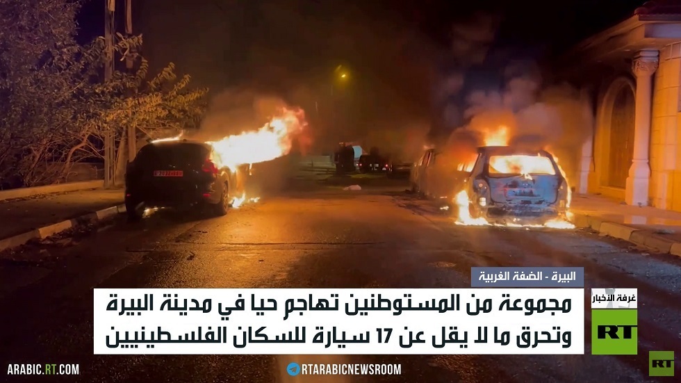 أقدم مستوطنون إسرائيليون على إضرام النيران في عدد من مركبات الفلسطينيين، خلال هجوم استهدف حيا بمدينة البيرة.