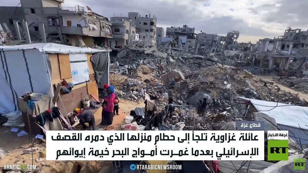 يفاقم المنخفض الجوي معاناة النازحين في غزة، حيث أجبر ارتفاع موج البحر عائلة سلامة على هجر خيمتها بعدما غمرتها المياه، فلم تجد لها ملاذا سوى الإقامة فوق ركام منزلها المهدم.