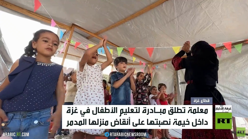 إسراء أبو مصطفى معلمة في قطاع غزة، بادرت لإنشاء مدرسة في خيمتها التي أقامتها على أنقاض منزلها المدمر، بهدف تعليم الأطفال المنقطعين عن الدراسة مع استمرار الحرب على القطاع.