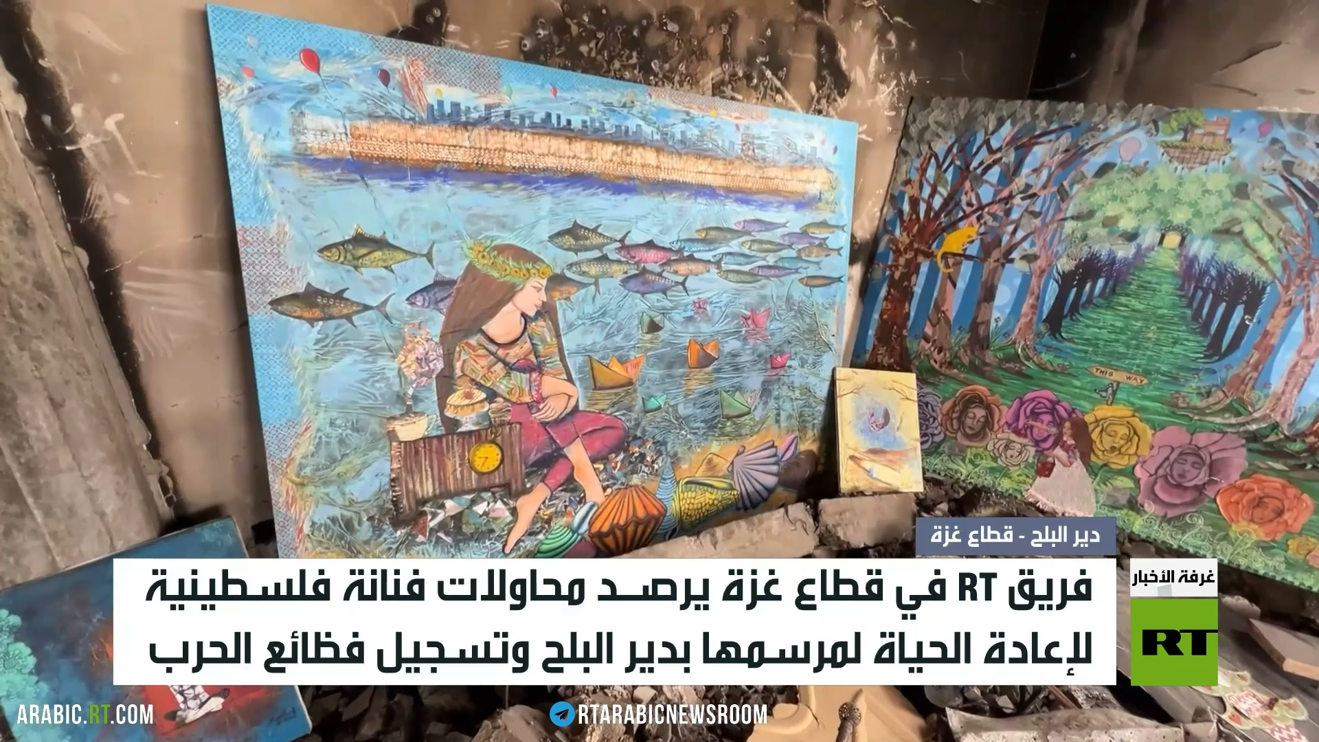 ترسم الفنانة الفلسطينية ميساء يوسف لوحات فنية تجسد مآسي الحرب الإسرائيلية على قطاع غزة.