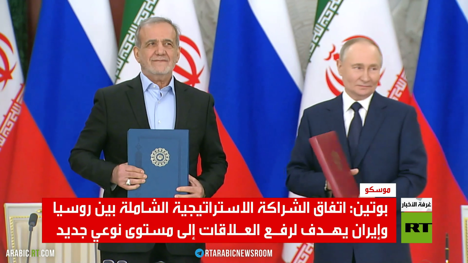 وقع الرئيس الروسي فلاديمير بوتين ونظيره الإيراني مسعود بزشكيان خلال قمة جمعتهما في موسكو اتفاقية شراكة استراتيجية بين البلدين.