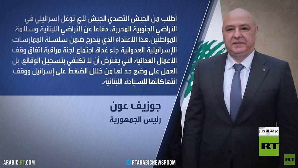تصريحات عون جاءت عقب مقتل شخص وإصابة أخرين في توغل إسرائيلي وغارات على بلدات استهدفت عمق الجنوب اللبناني.