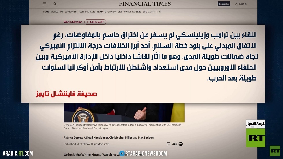 كشف الإعلام البريطاني وجود خلافات بين كييف وواشنطن عقب طلب زيلينسكي ضمانات أمنية تمتد لخمسين عاما من قبل الأمريكيين..