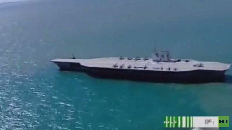 وبنى الحرس حاملة طائرات افترض صراحة أنها أمريكية، ثم جعلها هدفا لهجوم بالزوارق السريعة، وأمطرها بالصواريخ.