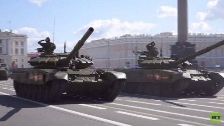 ومرت بجانب القصر الشتوي، وهو متحف "الإرميتاج - حاليا"، أحدث المعدات العسكرية إلى جانب الآليات، التي استخدمت أيام الحرب، مثل الدبابة "تي 34" الشهيرة.