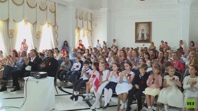 ونظم المركز الثقافي التابع للكنيسة الروسية في إمارة الشارقة احتفالية لتوزيع شرائط القديس جاورجيوس التي تعتبر رمزا للمجد العسكري والنصر.