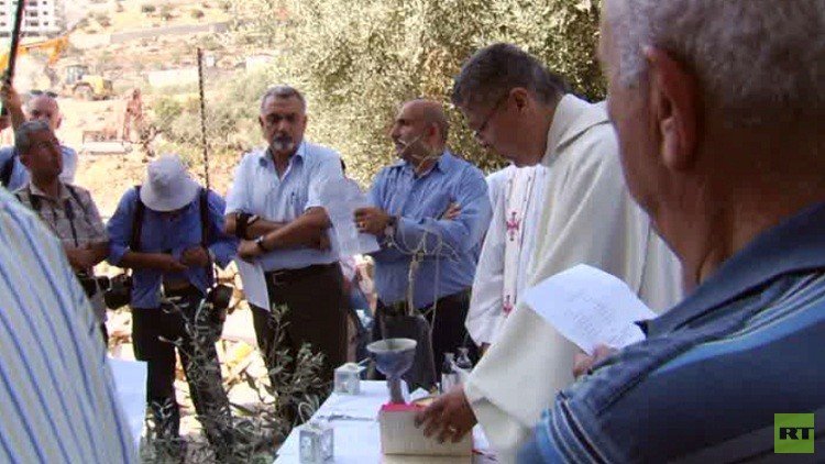 وفي مشهد سريالي وقف رجال الدين وأصحاب الأرض برفقه مجموعه من المتضامنين يصلون ويعتصمون ضد قرار إسرائيل بتجريف أراضي الفلسطينيين في بيت جالا استعدادا لاستكمال أعمال بناء الجدار العازل.