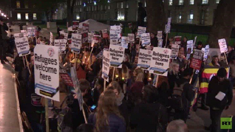 احتشد عدد من المتظاهرين أمام مقر رئاسة الوزراء البريطانية مطالبين حكومةَ ديفيد كاميرون بفتح أبواب بريطانيا لاستقبال اللاجئين على غرار ما قامت به ألمانيا.