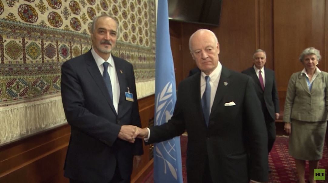 في سويسرا افتتح المبعوث الأممي إلى سوريا ستيفان دي ميستورا مباحثات "جنيف ثلاثة" بشأن سوريا بلقاء رئيس وفد الحكومة السورية الى المفاوضات بشار الجعفري.