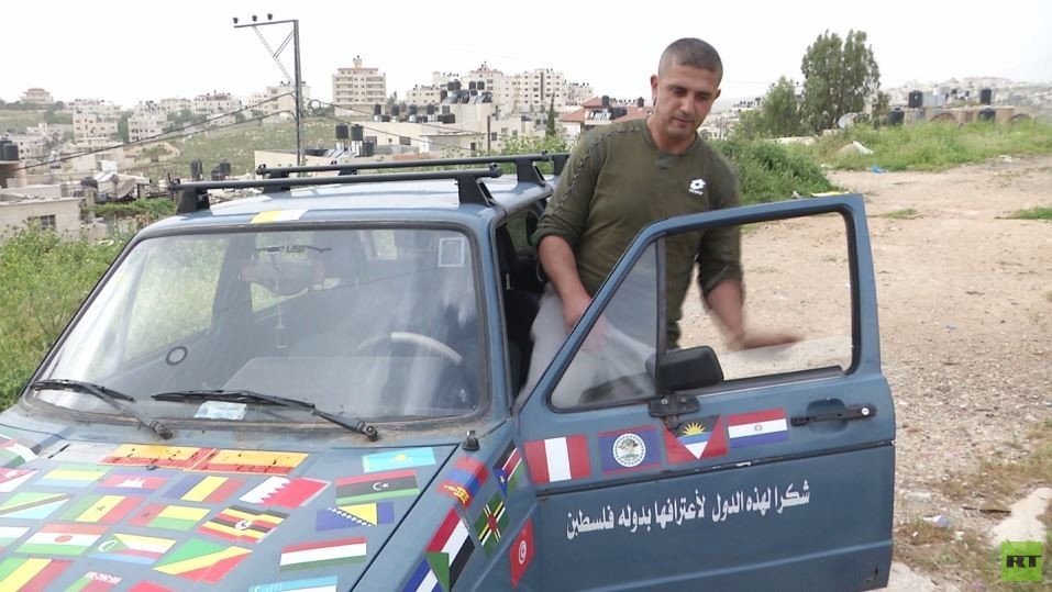 يقوم مواطن فلسطيني بتزيين سيارته بأعلام الدول التي اعترفت بدولة فلسطين وصوتت لها عضوا مراقبا في الأمم المتحدة.