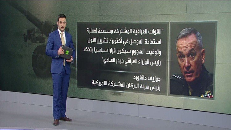 قال رئيس هيئة الأركان المشتركة الأمريكية جوزيف دانفورد إن القوات العراقية المشتركة مستعدة لعملية استعادة الموصل في أكتوبر تشرين الأول القادم.