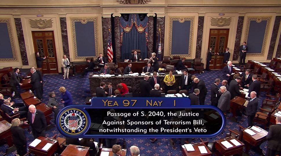 رفض الكونغرس الأمريكي نقض الرئيسِ باراك أوباما لقانون العدالة ضد الارهاب الذي يسمح بمقاضاة دول على خلفية أحداث الحادي عشر من سبتمبر عام ألفين وواحد.