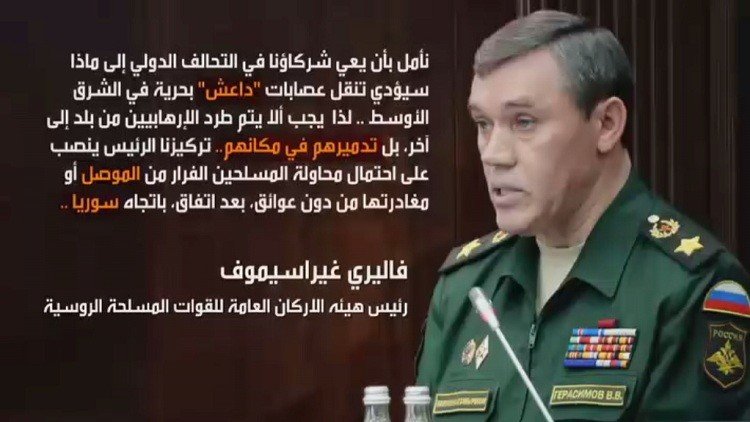 حذر رئيس هيئة الأركان العامة للقوات المسلحة الروسية الجنرال فاليري غيراسيموف من إمكانية هروب مسلحي داعش من الموصل الى سوريا.