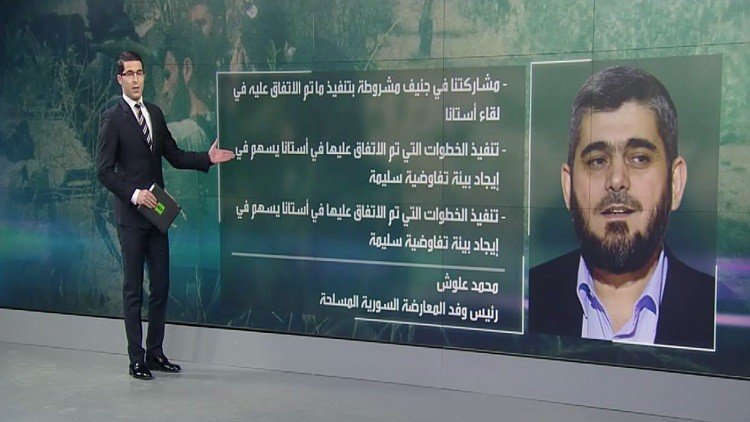 أكد رئيس وفد المعارضة السورية المسلحة /محمد علوش/ أن مشاركة المعارضة في مفاوضات جنيف مشروطة بتنفيذ ما تم الاتفاق عليه من تفاهمات في لقاء أستانا.