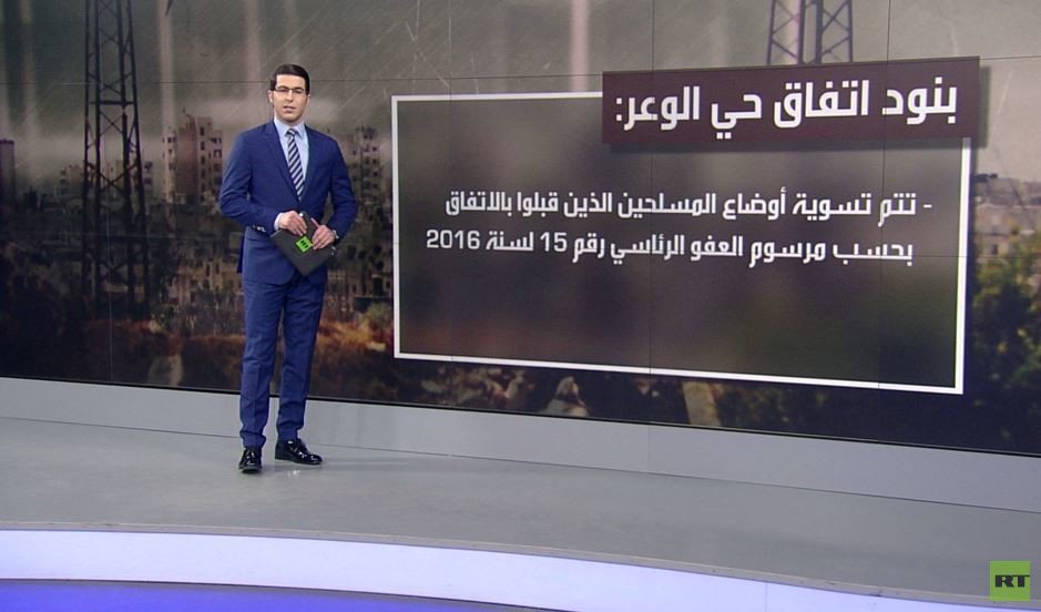 وقع ممثلون عن الحكومة السورية والفصائل المسلحة اتفاقا يقضي بخروج المسلحين وأسرهم من حي الوعر في حمص إلى مناطق في الشمال السوري خلال الأسابيع المقبلة، وتسوية أوضاع من يرغب بالبقاء