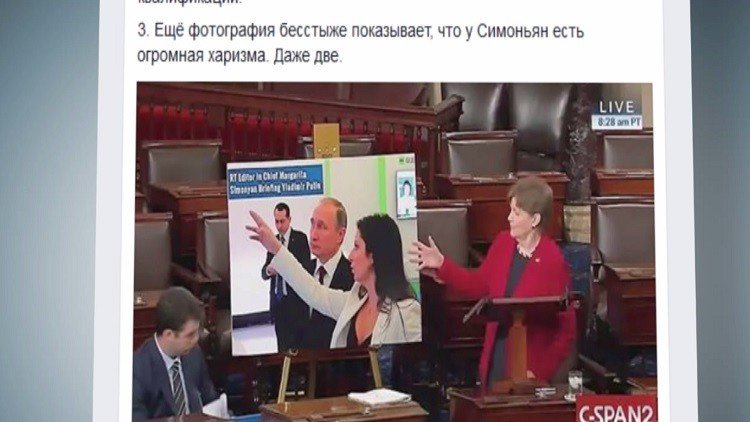 استعرضت السيناتور الأمريكية جين شاهين صورة وصفتها بالسرية يظهر عليها الرئيس الروسي فلاديمير بوتين ورئيسة تحرير قناة RT، لتستند عليها في اتهامها الإعلام الروسي بالمسيس.