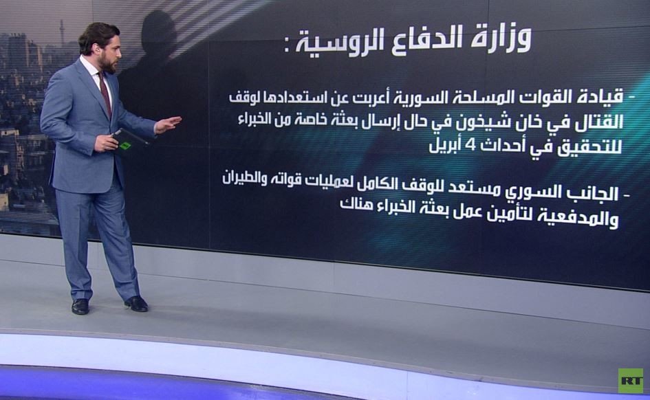 أعلنت وزارة الدفاع الروسية استعداد دمشق لوقف كامل أعمالها القتالية في محيط خان شيخون بريف إدلب في حال تم إرسال بعثة خاصة من خبراء للتحقيق في حقيقة ما جرى هناك بداية الشهر الجاري