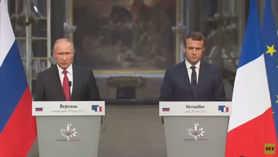 أكد الرئيس الروسي فلاديمير بوتين خلال مؤتمر صحفي مع نظيره الفرنسي إيمانويل ماكرون في قصر فيرساي بباريس، أكد أنه لا يمكن محاربة الإرهاب بتخريب الدول بل بتوحيد الجهود.
