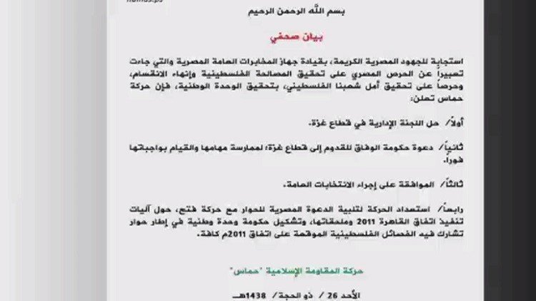 أعلنت حركة حماس حل لجنة إدارة قطاع غزة وموافقتها على إجراء انتخابات عامة بعد دعوتها حكومة الوفاق إلى ممارسة مهامها في القطاع.. يأتي ذلك بعد توصل فتح وحماس إلى تفاهمات جديدة.