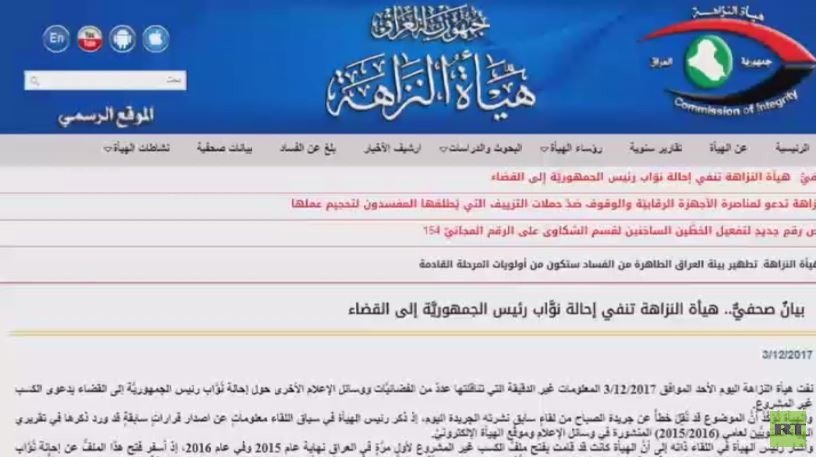 نفت هيئةُ النزاهة العراقية ما تردد من أنباء حول إحالةِ نوابِ رئيس الجمهورية الثلاثة، أسامة النجيفي، ونوري المالكي، وإياد علاوي، إلى القضاء بتهمِ الكسبِ غير المشروع.