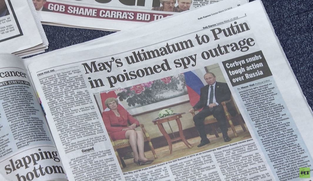 وفيما ستكشف رئيسة الوزراء تيريزا ماي عن الخطوات البريطانية اللاحقة، بدأت وسائل الإعلام البريطانية حملة تستهدف روسيا ورئيسها على خلفية التوتر الدبلوماسي بين لندن وموسكو.
