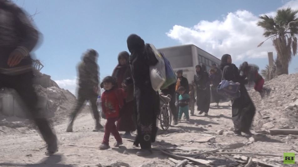 يتواصل خروج الآلاف من أهالي الغوطة الشرقية عبر معبر حمورية إلى مناطق سيطرة القوات السورية، حيث كثفت جهودها لاستقبال أكبر عدد من المدنيين في مراكز إيواء مؤقتة
