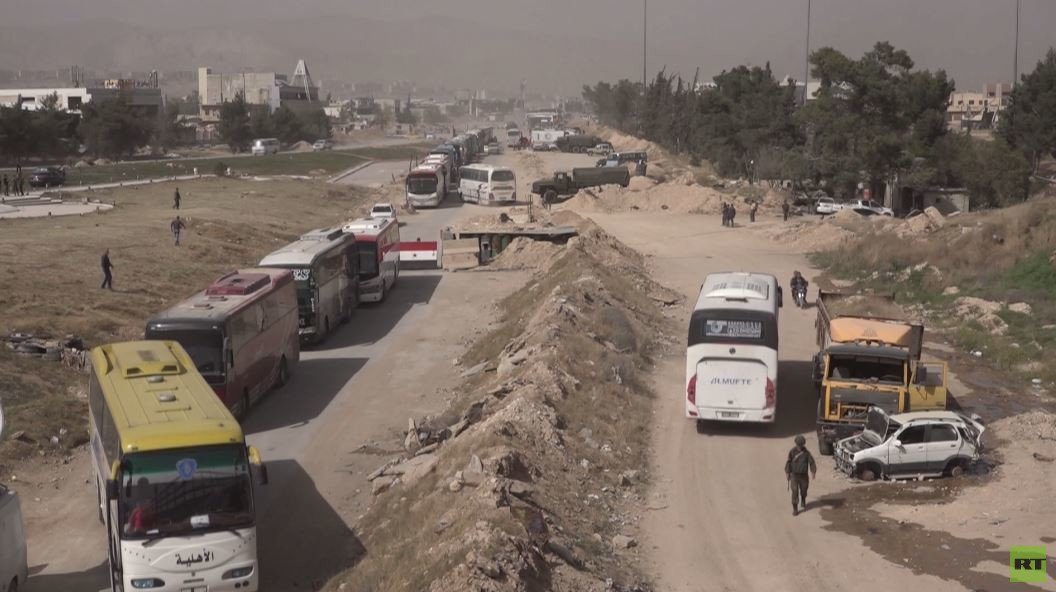 تتواصل عملية خروج مسلحي فيلق الرحمن وجبهة النصرة من الغوطة الشرقية حيث غادر الآلاف من مسلحي التنظيمين وعائلاتهم بلدات عربين وزملكا وعين ترما وجوبر استعدادا لانتقالهم إلى إدلب.