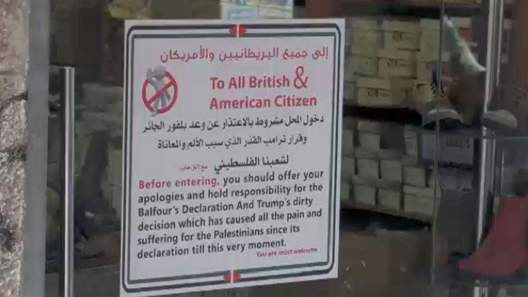 وضع أحد أصحاب المتاجر في رام الله، يافطةً اشترطت على البريطانيين والأمريكيين الاعتذار عن وعد بلفور وقرارات ترامب قبل دخوله.. مراسلتنا يافا ستيتي والتفاصيل.