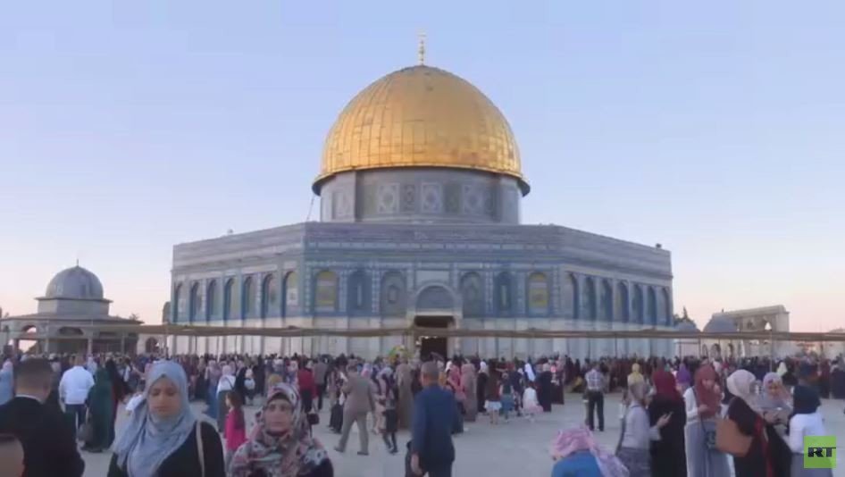 في القدس أدى تسعون ألف شخص صلاة عيد الفطر في المسجد الأقصى، ومن بينهم مصلون قدموا من دول أجنبية وعربية.