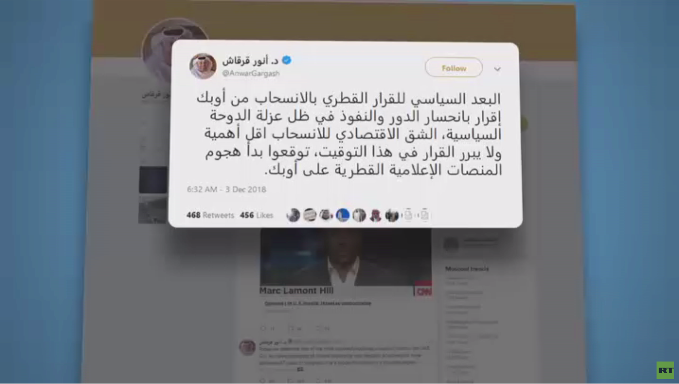 اعتبر(قرقاش) في تغريدة ، أن قرار الدوحة الانسحاب من "أوبك" دليل على انحسار دور قطر وعزلتها سياسيا، فيما أكد خبراء اقتصاديون في الإمارات أن القرار لن يؤثرعلى سوق النفط العالمية..