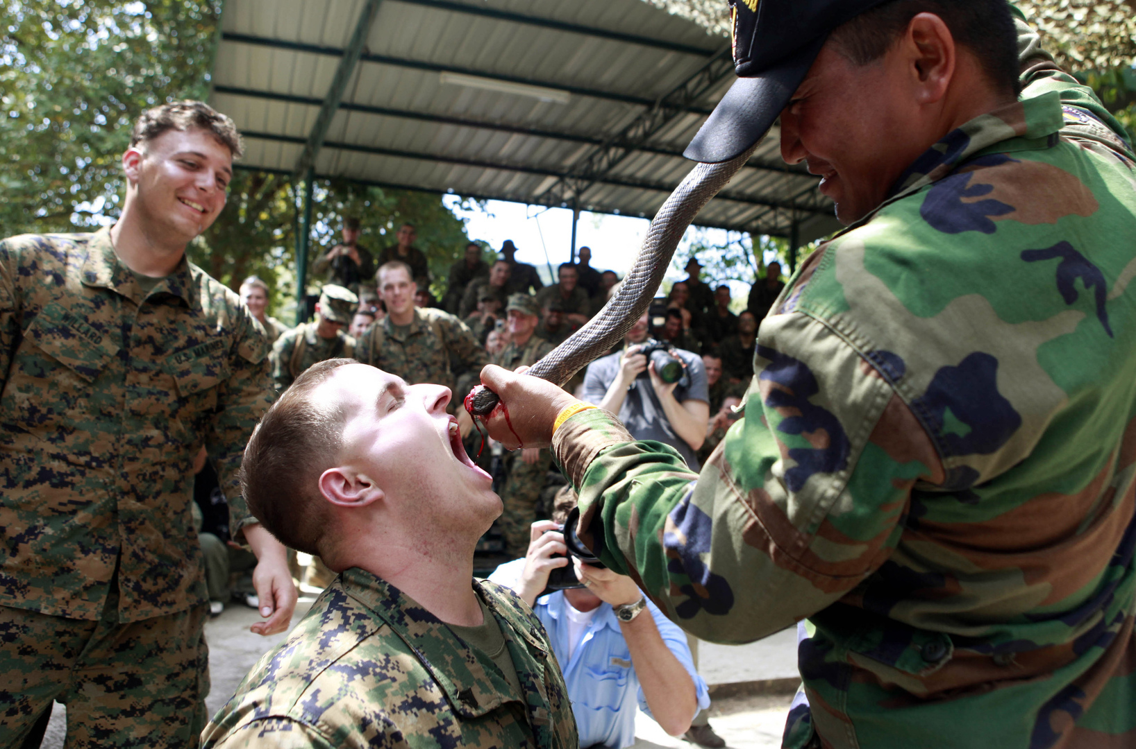 ويقوم الجنود الأمريكيون والتايلانديون بسلخ الأفاعي ويشربون دمائها في طقوس غريبة ومثيرة للاشمئزاز، وذلك أثناء تعلمهم تقنيات البقاء على قيد الحياة في الغابة، خلال معسكر كوبرا الذهبي السنوي الذي يقام في مدينة تشانثابوري، جنوب شرق تايلاند.
