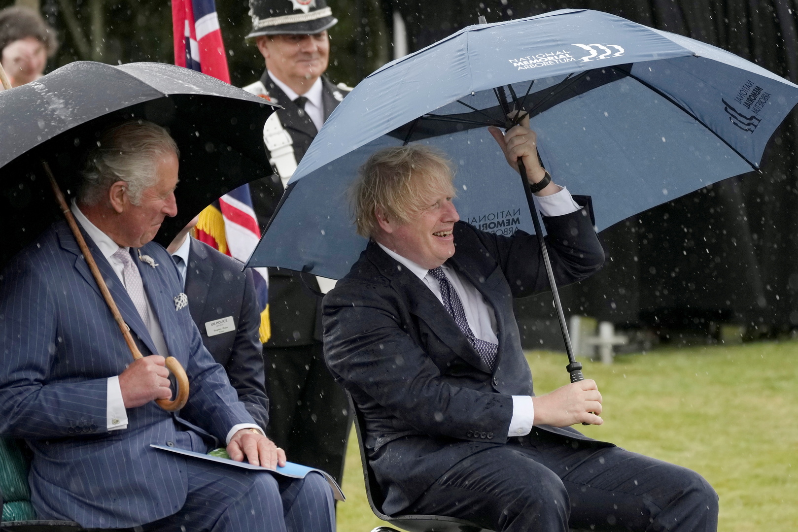 وقد شوهد جونسون والأمير شارلز يضحكان في خضم "المعركة" مع المظلة.