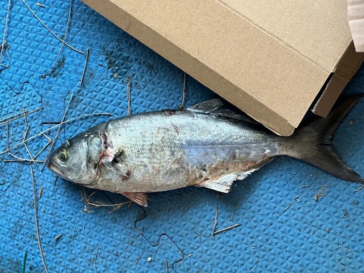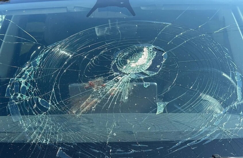 وعندما ذهبا للتحقيق، وجدا أن الزجاج الأمامي لسيارة تيسلا الخاصة بهما مكسور ومغطى بقشور السمك والدماء.