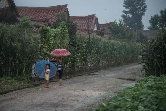 9. تظهر الصورة طفلتين تلجآن للمظلات للاختباء من المطر بالقرب من قرية تقع على مشارف بلدة سينشون.