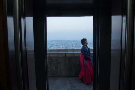 10. مرشدة سياحية في انتظار السياح في مبنى "Juche tower".