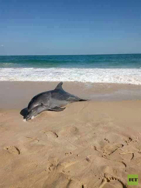 ظهر دلفين نافق على شاطئ مدينة رفح الفلسطينية في ظاهرة فريدة من نوعها أسبابها غير واضحة المعالم.