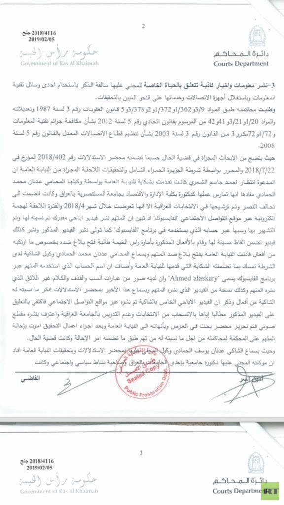 وأصدرت محكمة رأس الخيمة الإماراتية، حكما بسجن الصحفي أحمد حسين فؤاد، المتهم بفبركة فيديو إباحي للمرشحة الشمري، بحسب وثائق صادرة عن المحكمة.