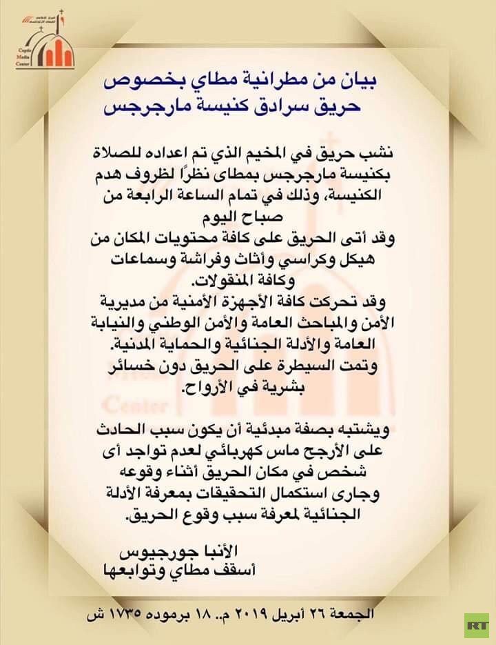 من جانبها، أفادت مصادر أمنية وكنسية موثوق بها لـRT أن ماسا كهربائيا تسبب في الحريق، وتم إخماده بمشاركة الأهالي من المسلمين.