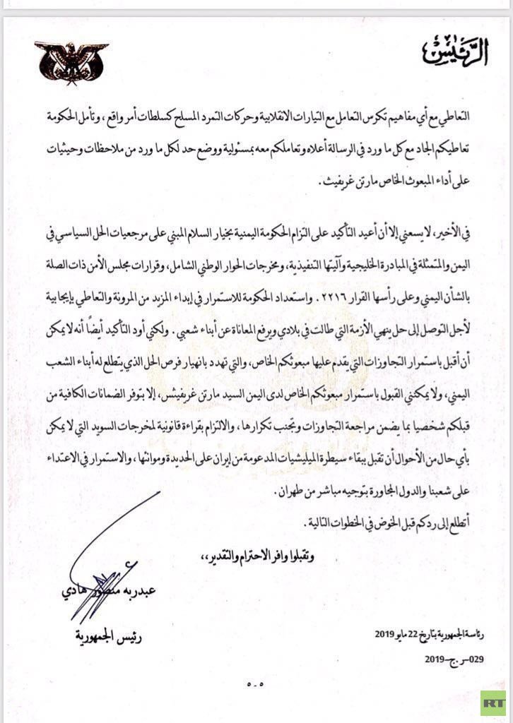 وقال هادي في رسالة وجهها لغوتيريش: "لا يمكنني القبول باستمرار مبعوثكم الخاص مارتن غريفيث إلا بتوفير الضمانات الكافية من قبلكم شخصيا بما يضمن مراجعة التجاوزات وتجنب تكرارها".