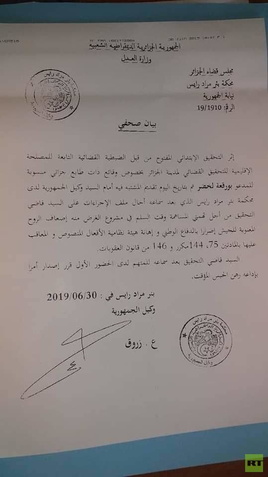 وأشار بيان صادر عن مجلس قضاء الجزائر تلقت RT نسخة منه، أن تحقيقا ابتدائيا فتحته الضبطية القضائية "بخصوص وقائع ذات طابع جزائي منسوبة للمدعو بورقعة لخضر"، حيث اتهم الأخير بـ "المساهمة في وقت السلم في مشروع الغرض منه إضعاف الروح المعنوية للجيش، إضرارا بالدفاع الوطني" و"إهانة هيئة نظامية".