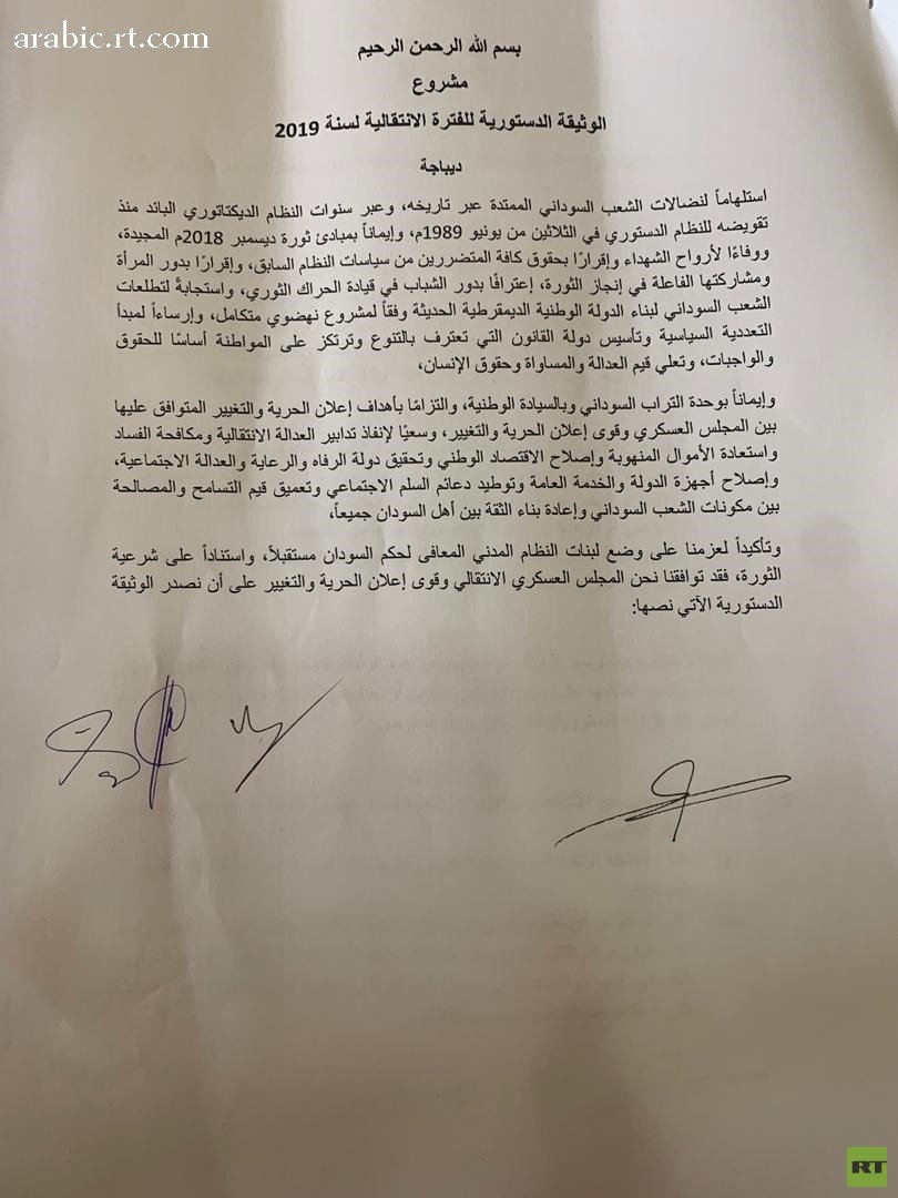 وقالت مصادر مطلعة لـ"رويترز" إن المجلس العسكري السوداني وائتلاف المعارضة الرئيسي سيوقعان بشكل نهائي على الإعلان الدستوري في الـ17 من أغسطس.