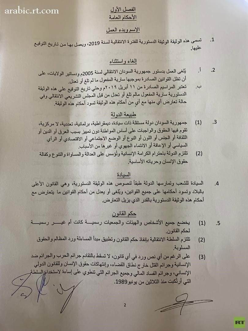 وقعت الأطراف السودانية اليوم الأحد في العاصمة الخرطوم بالأحرف الأولى على الإعلان الدستوري بعد الإجماع عليه أمس السبت.