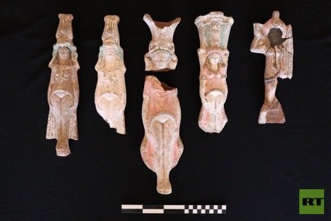 كما عثر أمام اللوحة على خمسة تماثيل مصنوعة من "التراكوتا لايزيس أفروديت"، وعدد من الأواني الفخارية الصغيرة وجدت على بوابة المدخل.