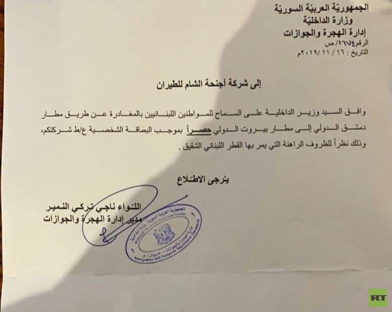 وأوضح مدير الهجرة والجوازات، ناجي النمير، في كتاب وجهه إلى شركة "أجنحة الشام للطيران" (شركة خاصة) أن وزير الداخلية "وافق على السماح للمواطنين اللبنانيين بالمغادرة عن طريق مطار دمشق الدولي إلى مطار بيروت الدولي حصرا، بموجب البطاقة الشخصية".