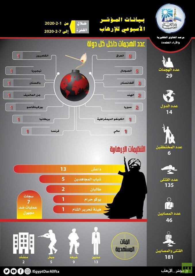 قال مرصد "الفتاوى التكفيرية والآراء المتشددة" التابع لدار الإفتاء المصرية، إن مؤشر الإرهاب، رصد وقوع 29 عملية إرهابية في 14 دولة حول العالم، خلال الأسبوع الأول من شهر فبراير.