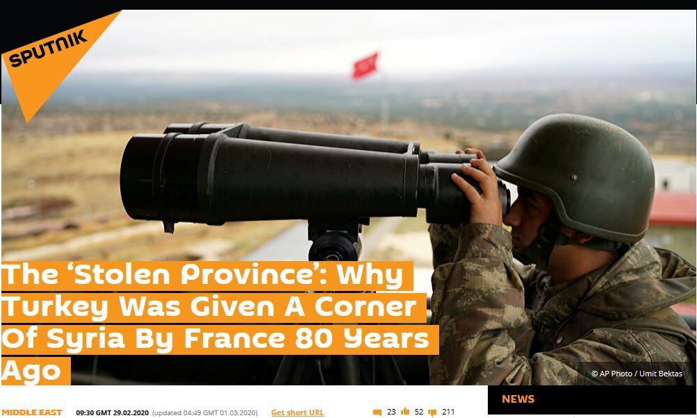 وذكرت صحيفة "زمان" التركية المعارضة أن تقرير "سبوتنيك" الذي حمل عنوانه سؤالا "لماذا منحت فرنسا تركيا هذا الجزء من سوريا قبل 80 عاما؟"، أثار موجة من الجدل حول سيادة تركيا على ولاية هطاي الحدودية مع سوريا، "في ظل حديث عن أطماع أنقرة لضم إدلب إلى أراضيها".