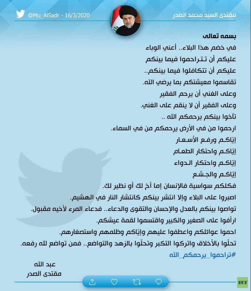 حذر زعيم التيار الصدري في العراق مقتدى الصدر، اليوم الاثنين، أصحاب المحال التجارية والتجار والصيادلة من استغلال أزمة فيروس كورونا ورفع الأسعار.