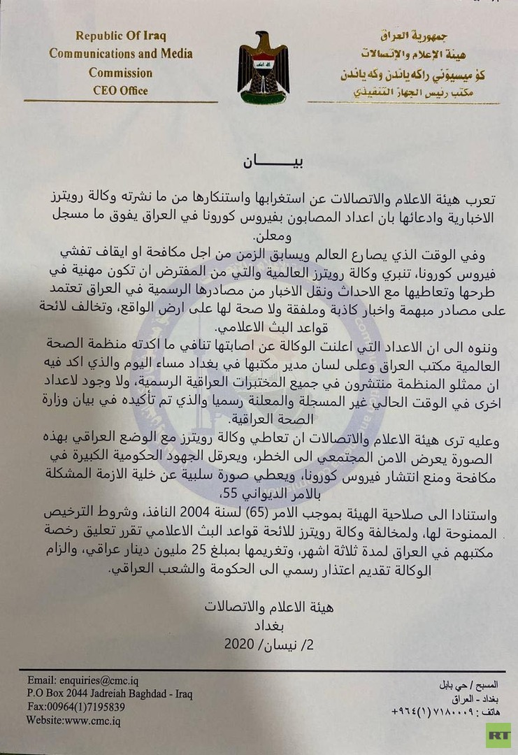 وفي كتاب رسمي حصلت عليه RT موجه من هيئة الإعلام والاتصالات العراقية جاء فيه أن "هذه المسألة تحدث في ظل الظروف الحالية التي لها تداعيات خطيرة على الصحة والسلامة المجتمعية".